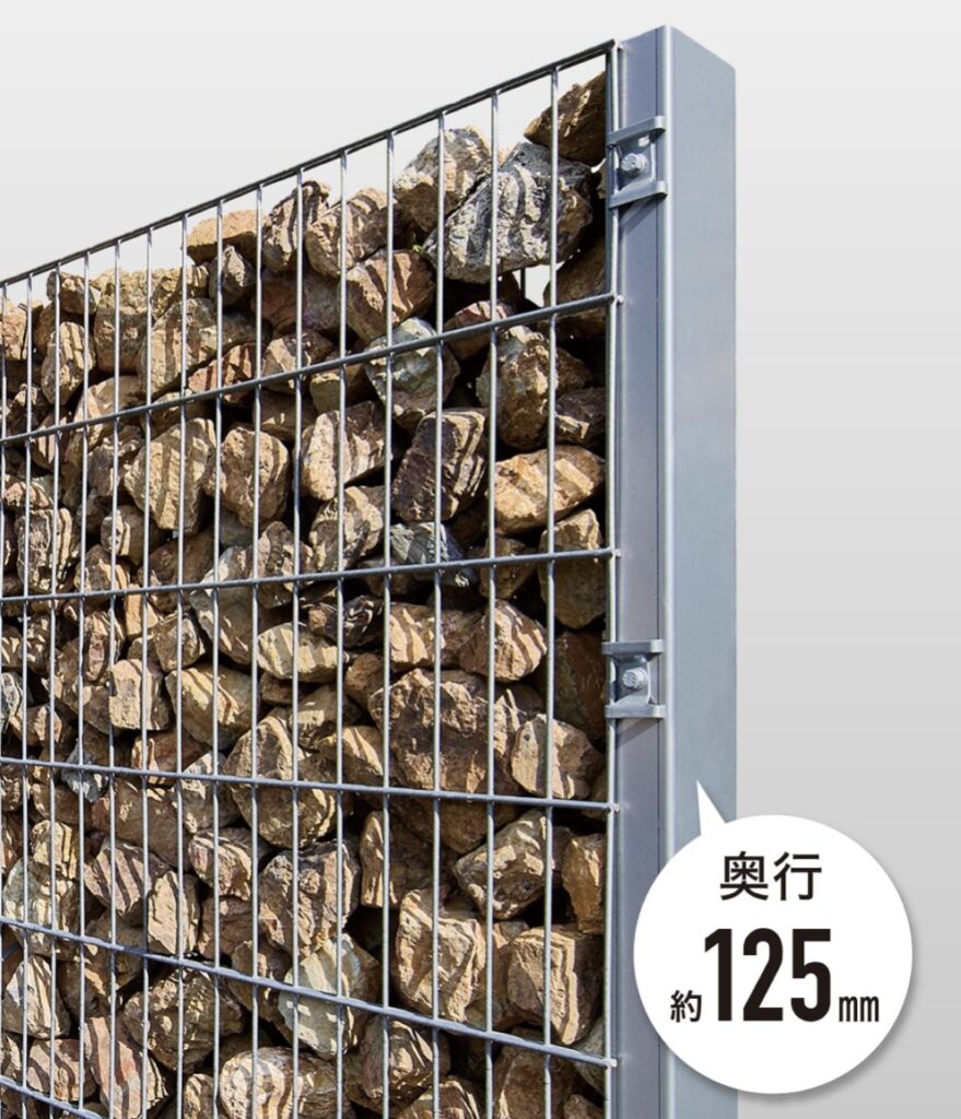 奥行きはわずか約125mm。これまで設置が難しかった狭小スペースでも、ガビオンのある景観を実現できます。特に、フェンスとして複数スパン設置する場合に真価を発揮します。奥行きが薄い分、材料費や工数を抑えコスト面でも有利に働くため、まとまった距離のフェンスプランにこそおすすめです。