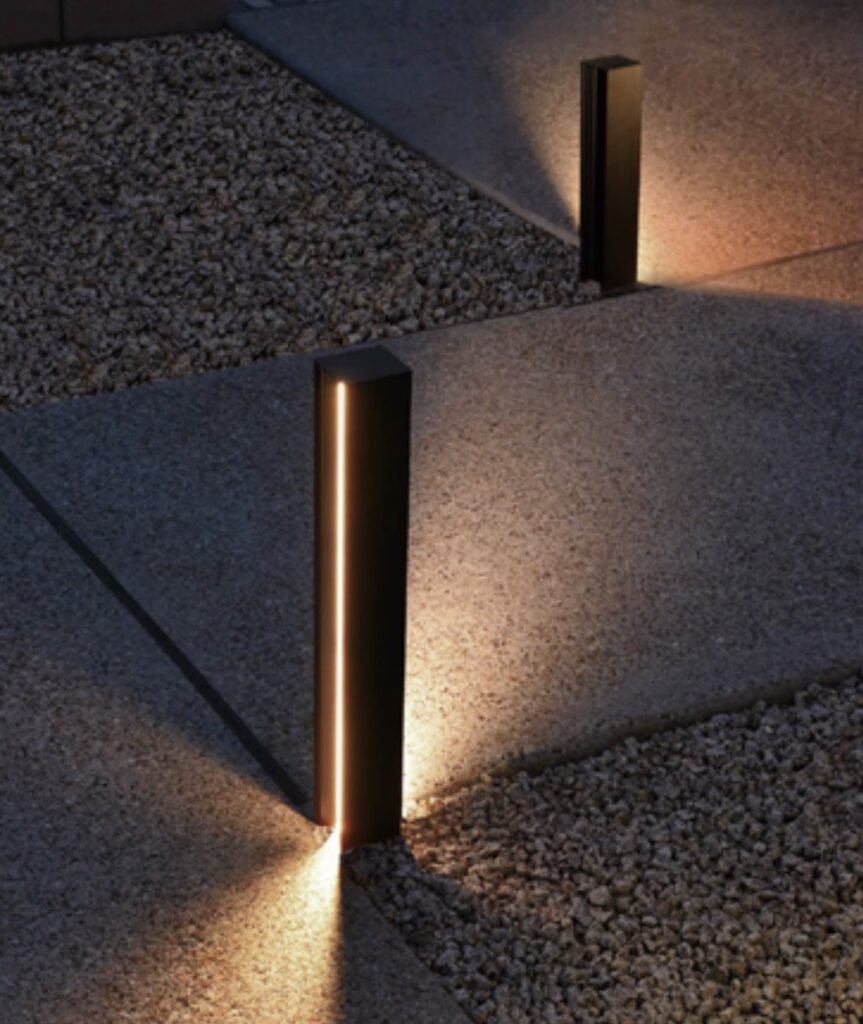 光を右斜め方向に照射する独創的な設計で、壁や地面にくっきりとしたラインの影を描き出します。昼間はシンプルな細身のフォルム、夜は表情豊かなライトアップ。シングル(片面発光)とダブル(両面発光)から選べるので、塀際にも通路にも対応します。