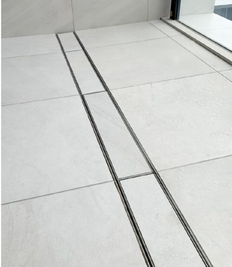 溝蓋が目立たず、自然に溶け込む美しい空間を実現します。 お使いのタイル(厚み 12mm 以下)をカットして、モルタルでステンレス製の上蓋に固定する仕様です。 耐久性に優れた錆びにくい素材で、機能性とデザイン性を両立しています。