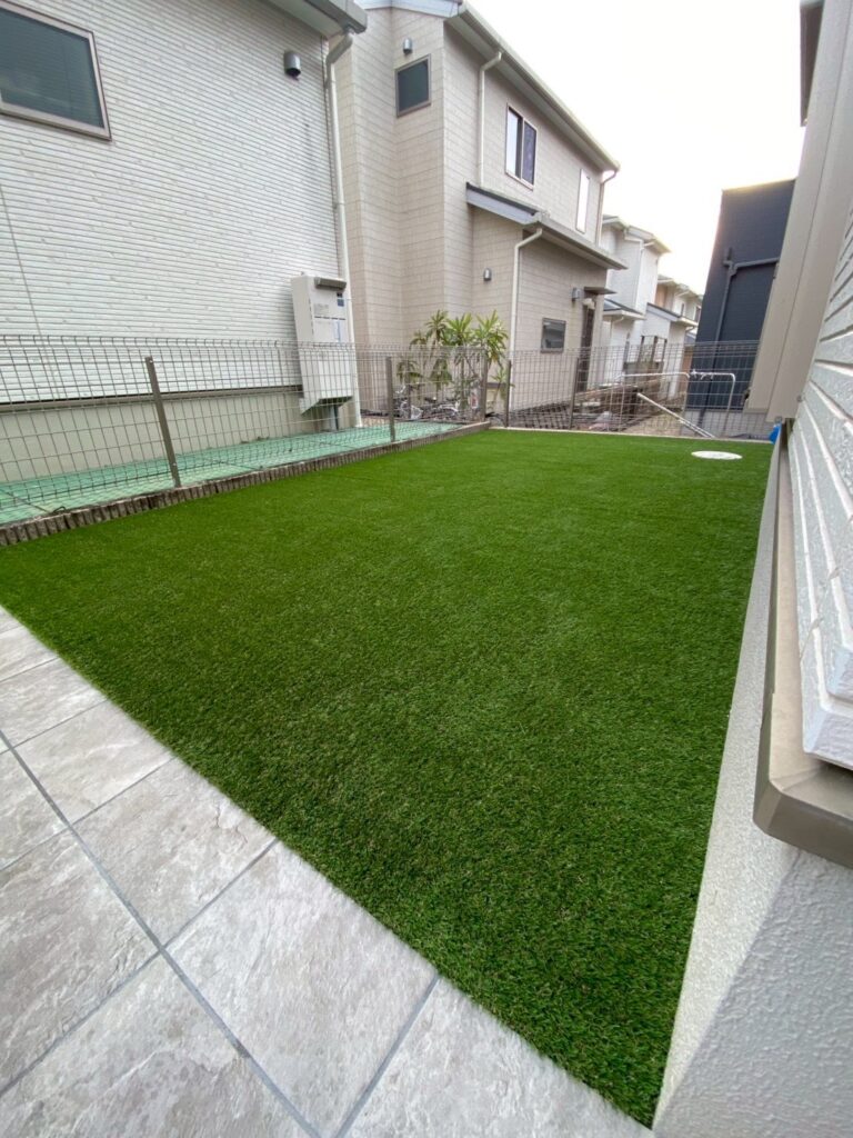 お庭一面に人工芝を敷き、