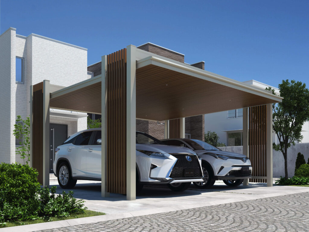 フラットでシャープな屋根ラインが特徴のスタイリッシュカーポート。