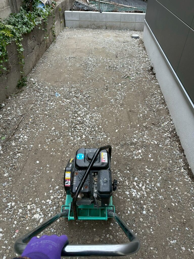 その後、プレートでしっかり転圧をかけ、地盤を締め固めていきます。
