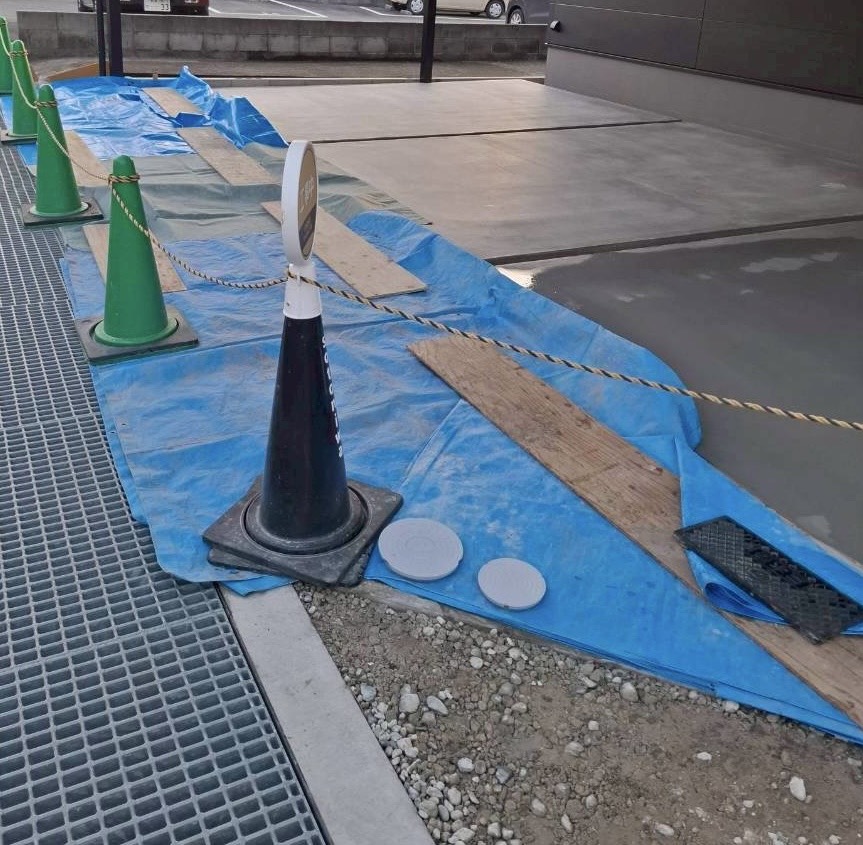 コンクリート打設後は、強度が出るまで養生期間を設け、シートや仮設材でしっかり保護しています。