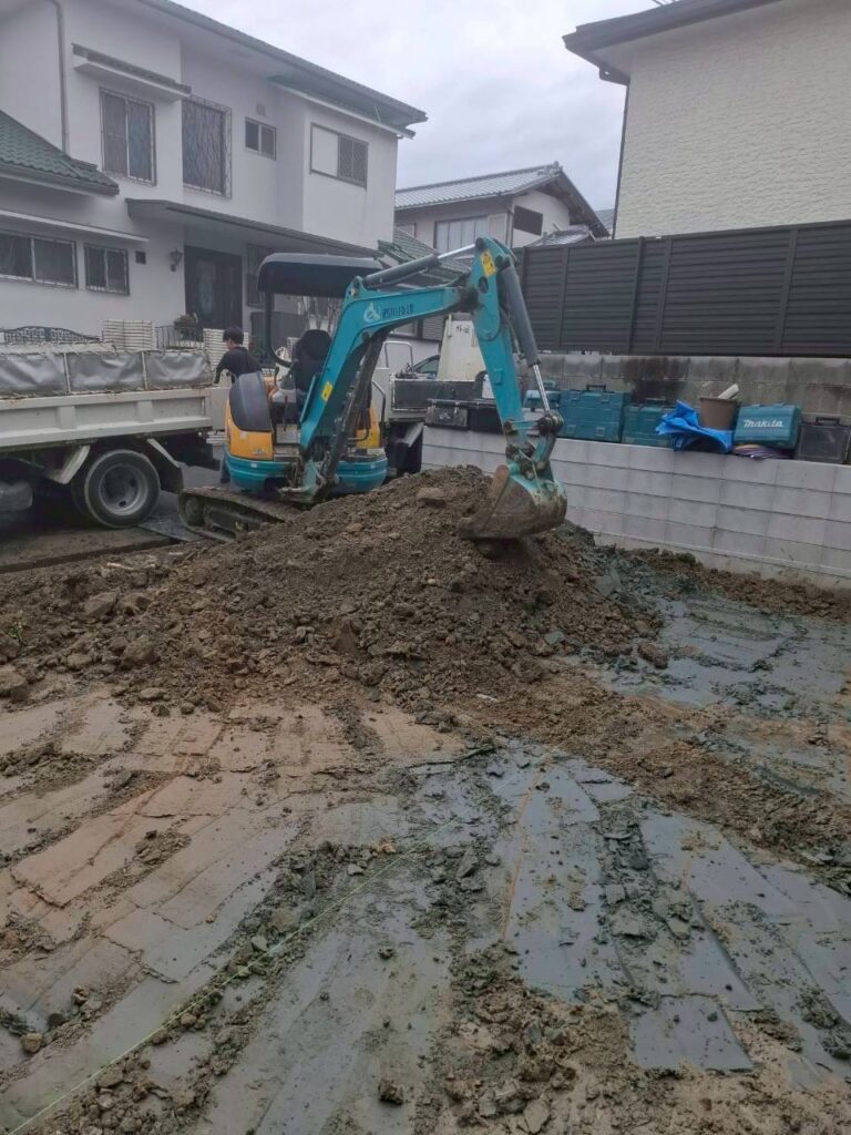 既存の土を重機で丁寧に掘り起こし、不要な土を搬出していきます。