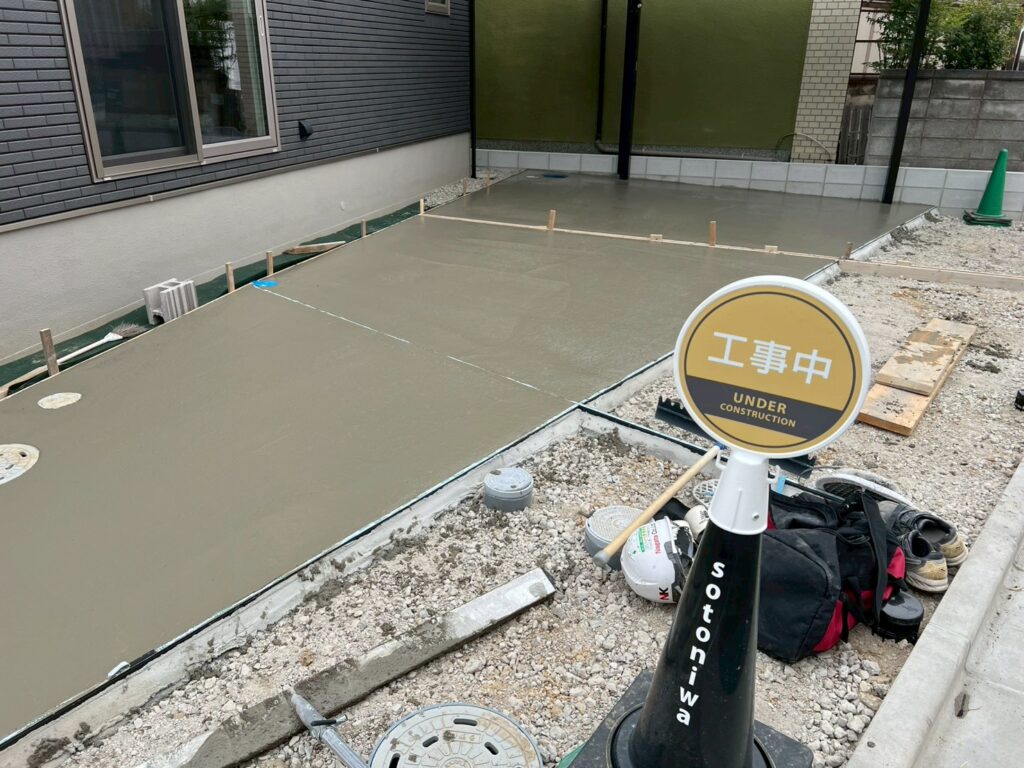 新築外構工事2の現場では土間コンクリートが打設されました💪✨手前は洗い出し仕上げを予定しているので別日に改めて施工する予定となっております😊!