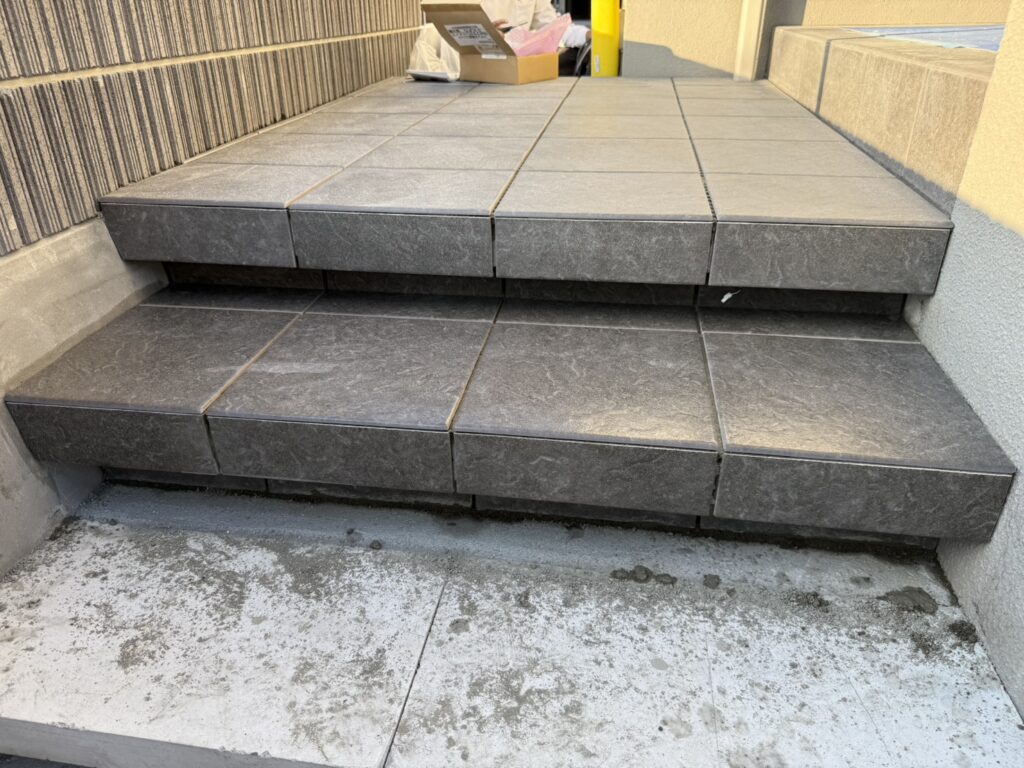 玄関ポーチの階段をタイル仕上げで施工しました。グレー系のタイルを使用し、落ち着いた印象に。玄関まわりは毎日通る場所なので、滑りにくくお手入れもしやすい素材を選んでいます。タイルの貼り方や段差のバランスにもこだわり、見た目だけでなく使い心地の良い階段に仕上がりました